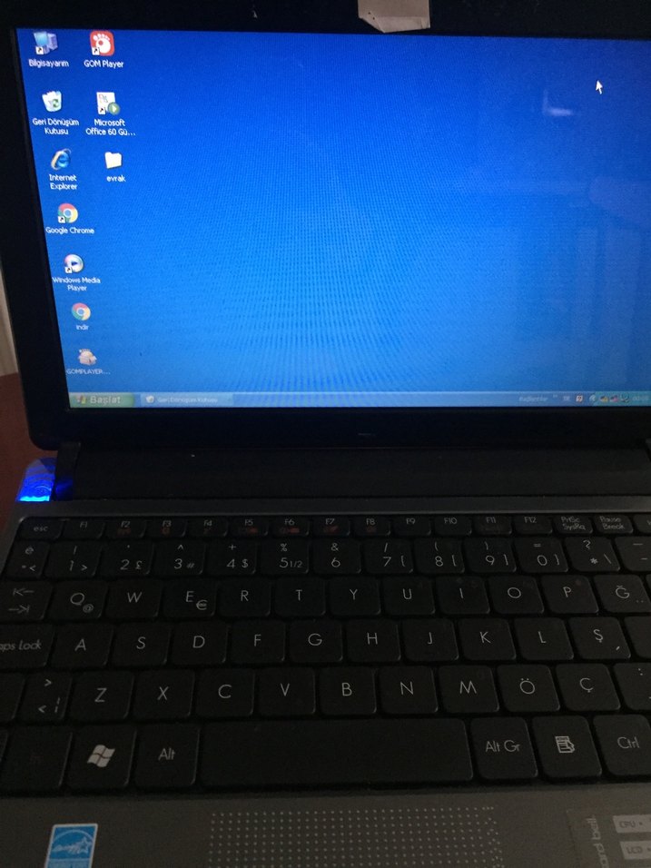 Mavi renkte, standart klavyeye ve masaüstü simgeleri görünen net ekrana sahip dizüstü bilgisayar.