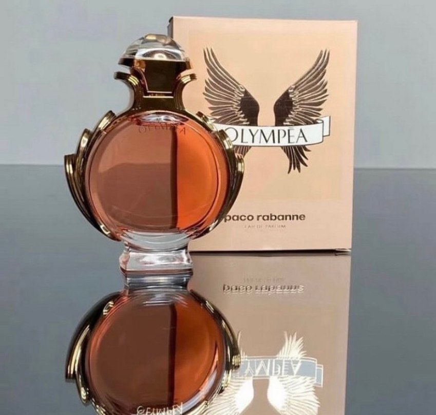 Paco Rabanne Olympea kadın parfümü, dikkat çekici şişe tasarımı ve zengin kokusuyla. Ambalajda kanatlı grafikler ve marka detayları bulunur.
