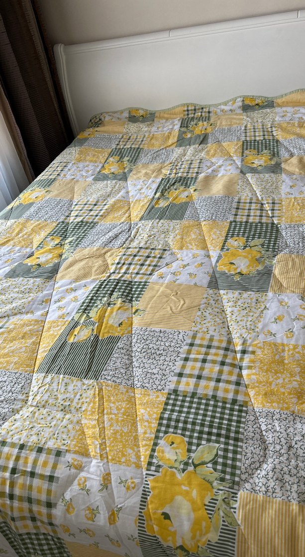 Yumuşak sarı ve gri tonlarda, çiçek ve çizgili detaylı pactwork görünümlü çok az kullandım vakumlu poşette durduğu için kırışık ölçüı270 /260 oldukça büyük Melike Zeynep marka iki küçük yastık ce iki yastık kılıfı var