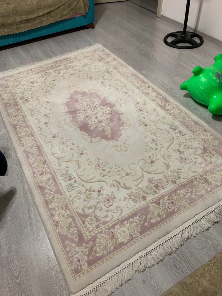 Pembe pastel tonlarında çiçek desenli, klasik tarzda bir halı. Püsküllü kenarları ve yumuşak renkleriyle sıcak bir ortam sağlar. Padişah markadır. 2 tane var elimde. 1,50x2,33 cm ölçüdedir. Üzerinde çok minik lekeler var . Yıkanınca çıkar . Çocuklu ev olduğumuz için leke kaçınılmazdır. İki halı birlikte fiyatıdır