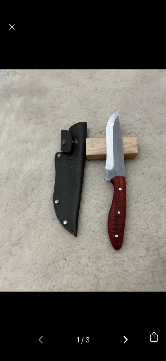 Keskin paslanmaz çelik bıçağa ve bordo ahşap sapına sahip bıçak, güvenli saklama için siyah deri kılıfla birlikte gelir.