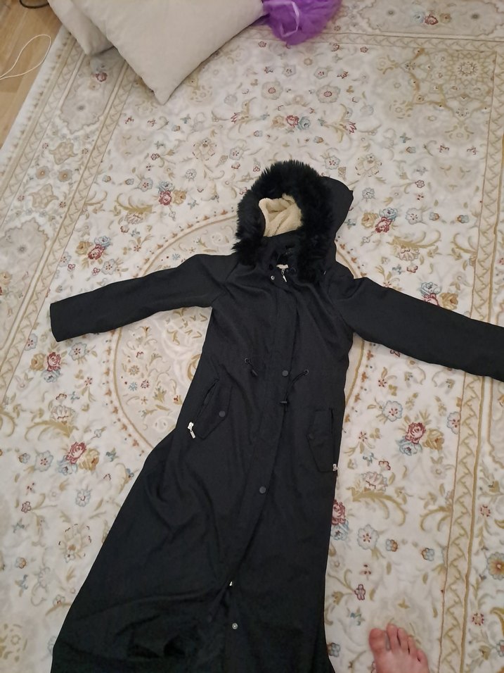 Siyah renkli, uzun kesim kadın mont, yüksek yakalı ve uzun kolludur. Kürklü kapüşon detayına sahip, yumuşak ve sıcak dokusuyla rahat ve şık bir görünüm sunar. 42 beden