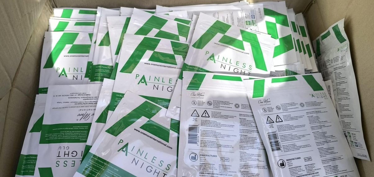 Painless Night dergileri, yeşil ve beyaz kapaklı, arka yüzünde detaylı bilgi ve talimatlar bulunuyor.