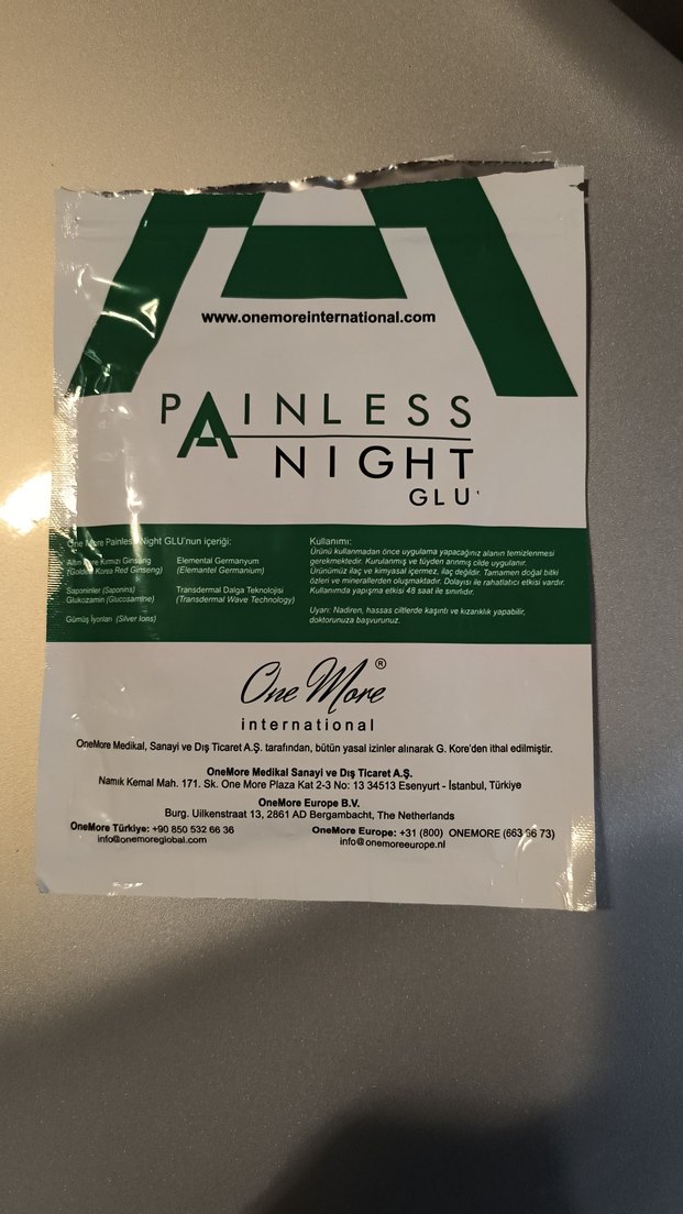 Painless Night GLU, OneMore International tarafından ağrısız gece kullanımı için tasarlanmış bir üründür. Pakette kullanım talimatları ve iletişim bilgileri yer almaktadır.