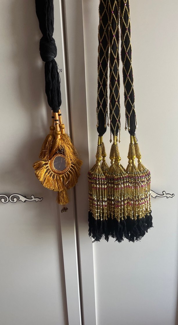 Toplam 4 adet 3 adet olanlar aynı model. Son resimde görülüyor. Soldaki sarı dore aynalı tek parça. Pakistandan etnik dekoratif boncuklu dekor. Perde Bağlama Püskülü renkli boncuk işlemeli Çok renkli fon bağlama püskülleri, klasik tarzda detaylı süslemelerle. Avize yapılabilir, duvar kapı dekoru veya perde fon tutucu olabilir.uzunluğu 95 cm. İşlemeli bölüm uzunluğu 30 cm