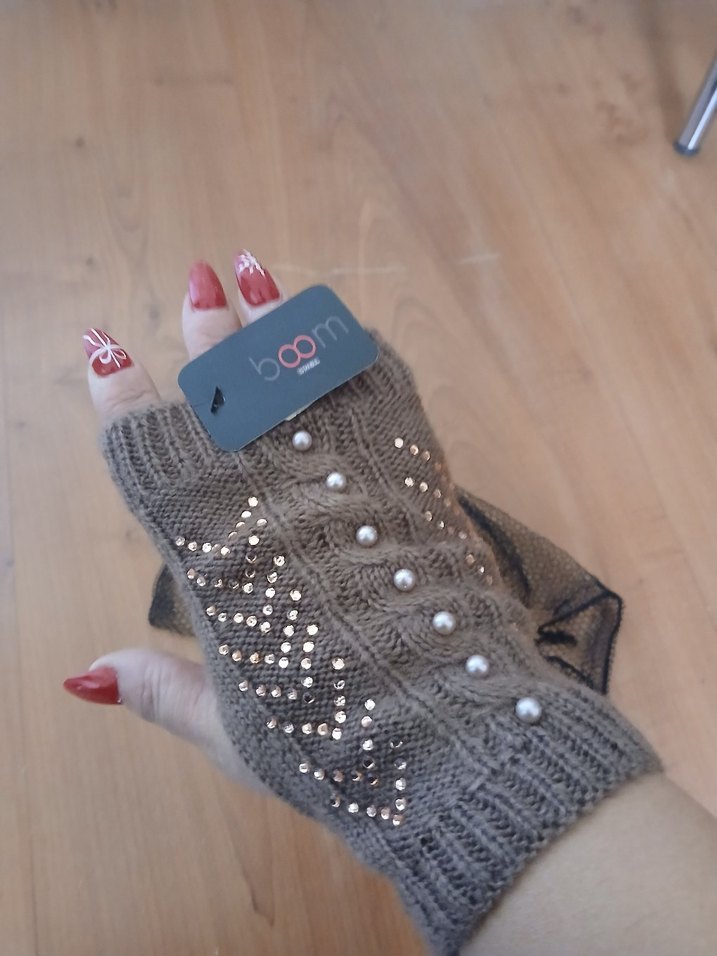 Kahve örgü kadın eldivenleri inci detaylarıyla sıcak ve rahat. Trendy casual sokak stiline uygun, file çanta ile birlikte gelir. #parmaksızeldiven