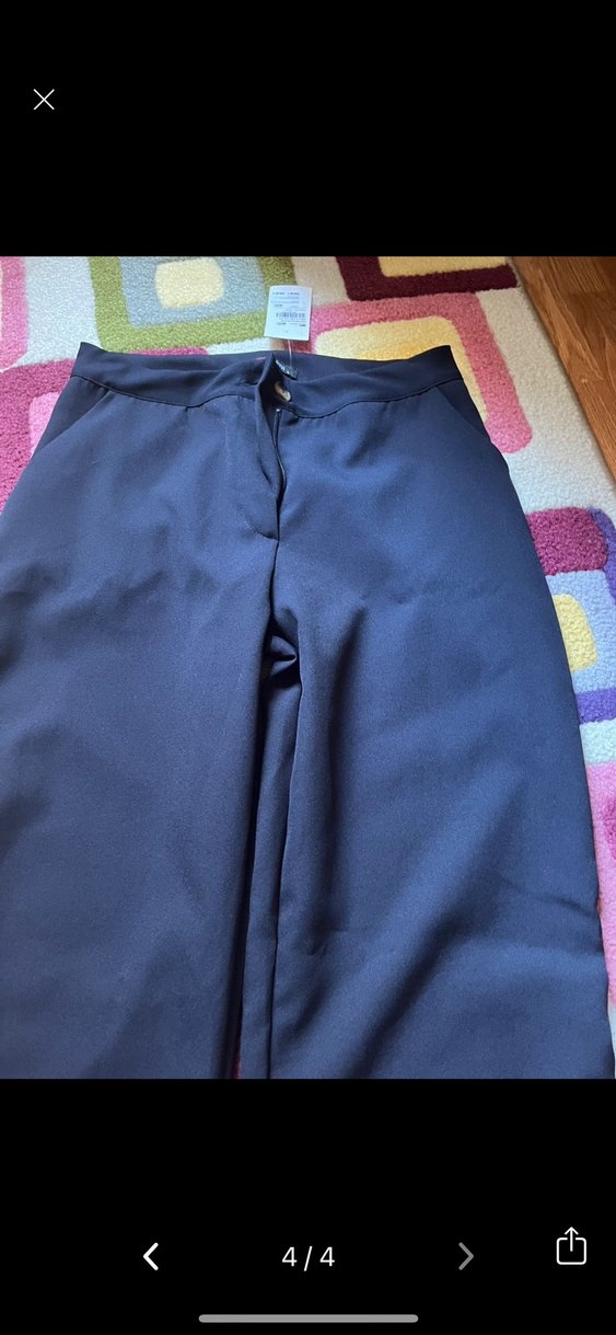 Düğmeli, midi boy, loose fit kadın mavi kumaş pantolon. Koyu renk ve yumuşak sentetik kumaştan, ofis için uygun.