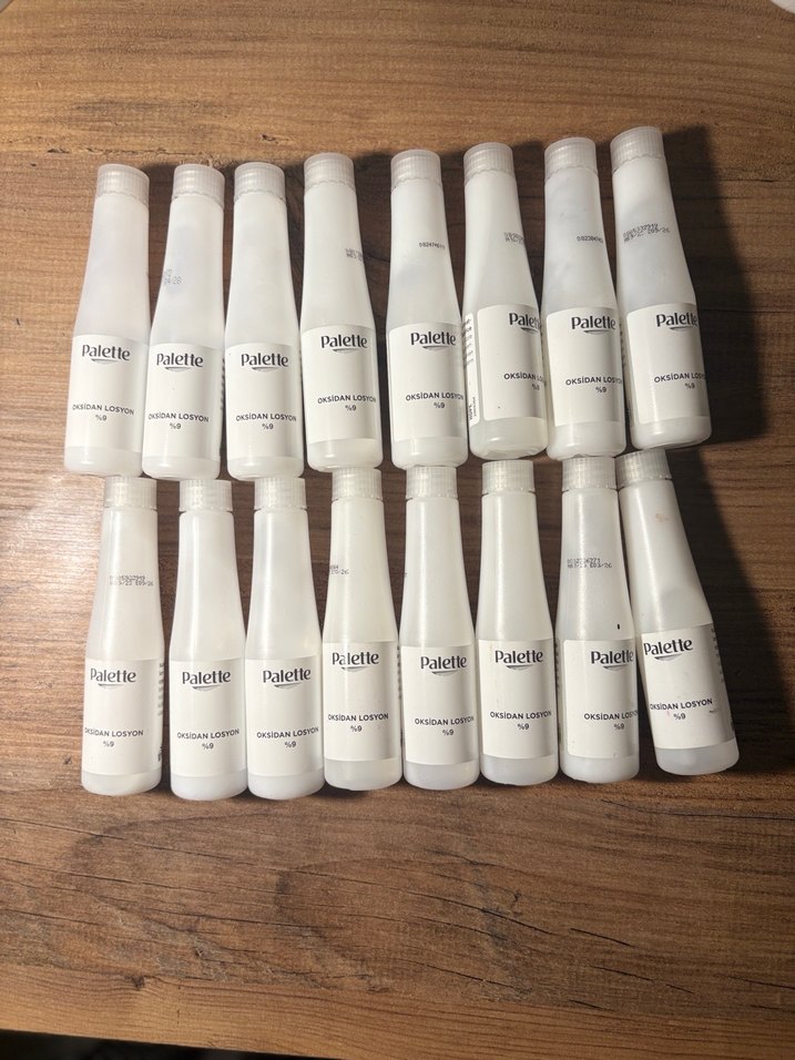 Palette boyaların içinden çıkan 50 ml’lik oksidanlardır. Toplam 16 adet, hiçbiri açılmamış ve %9 (30 volüm) oksidandır. Hepsi yeni, kutudan çıktığı gibi duruyor. Toplu almak isteyenler için uygun fiyat verilebilir.