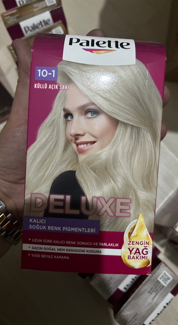 Palette Deluxe 10-1 küllü açık sarı saç boyası, zengin yağ bakımıyla uzun süre kalıcı soğuk renk pigmentleri ve %100 beyaz kapama sağlar, saçın doğal nem dengesini korur.