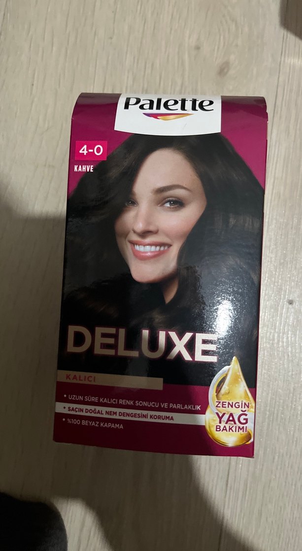 Palette Deluxe 4-0 kahve kalıcı saç boyası, zengin yağ bakımı, doğal nem dengesi koruması ve %100 beyaz kapama sağlar.