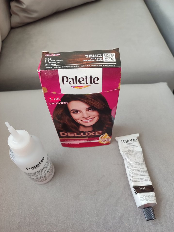 Palette Deluxe saç boyası 3-65 kestane kahve renginde, renk kremi ve oksidan içerir. oksidondan yarı kalmış boya az kullanılmıştır.