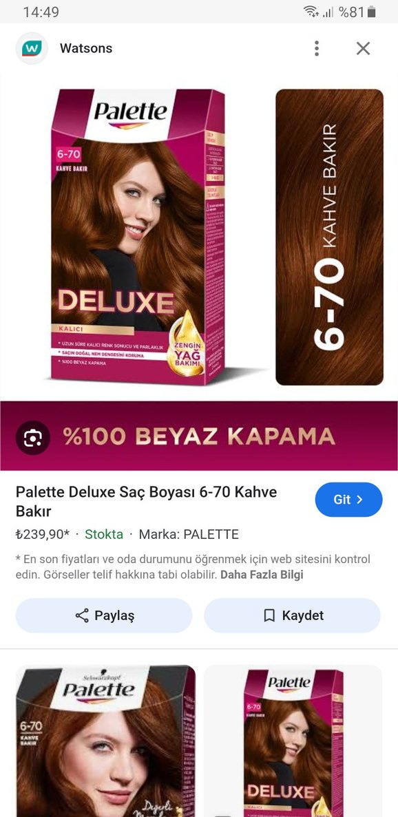 Palette Deluxe 6-70 Kahve Bakır saç boyası, zengin yağ bakımı ve %100 beyaz kapama sağlar, kalıcı ve doğal görünüm sunar. Sadece bir tutam sacimda denedim bir nohut tanesi kadar bile degil yani.yeni.