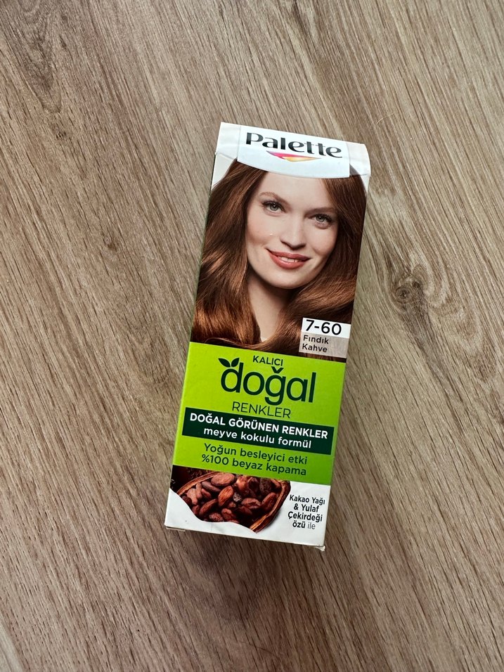 Palette kalıcı saç boyası 7-60 numara, doğal görünümlü renkler ve meyve kokulu formülle yoğun besleyici etki sağlar, %100 beyaz kapama sunar.