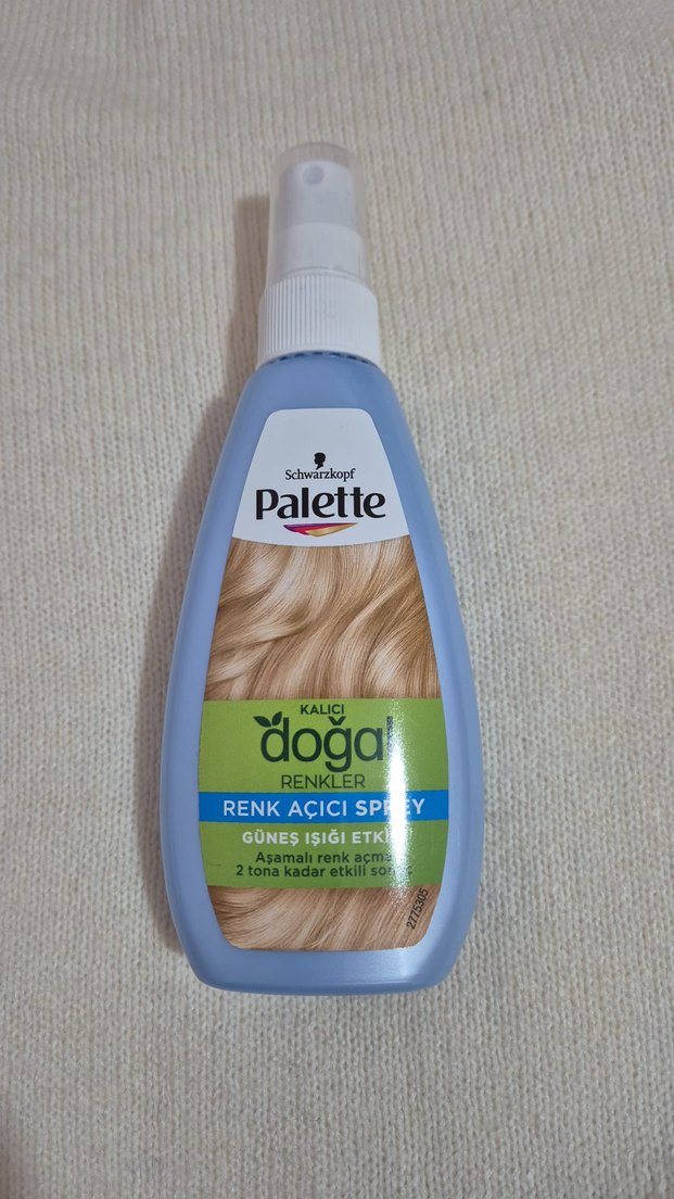 Palette doğal renk açıcı sprey, güneş ışığı etkisiyle saç rengini aşamalı olarak 2 tona kadar açar. Kalıcı ve doğal görünüm sağlar. Yarısı dolu.