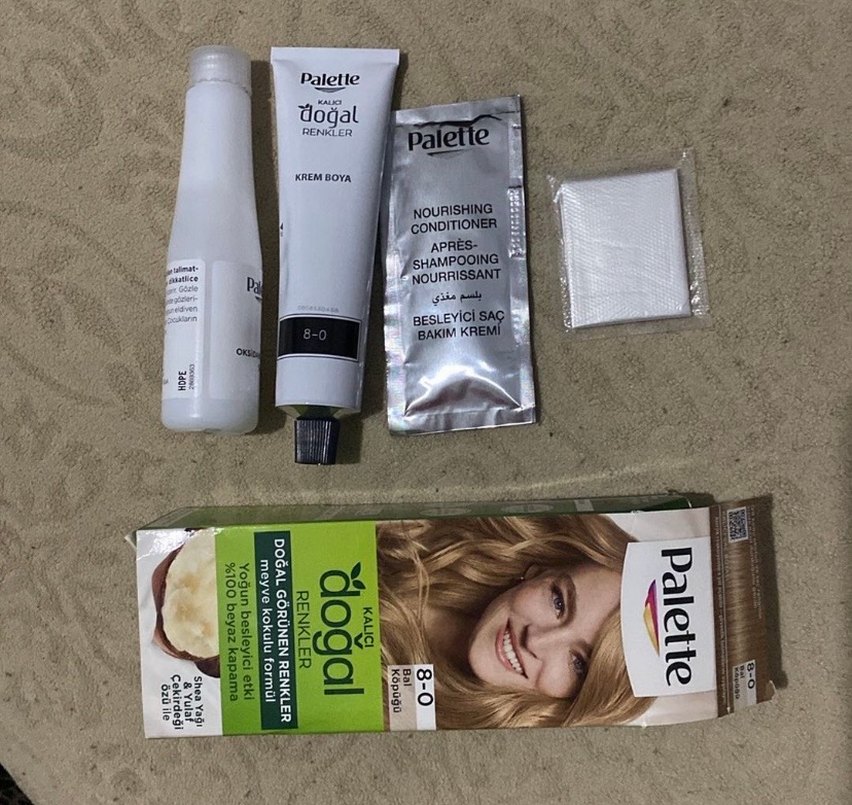 Palette Doğal Renkler saç boyası 8-0, besleyici saç bakım kremi, krem boya ve oksidan içerir.