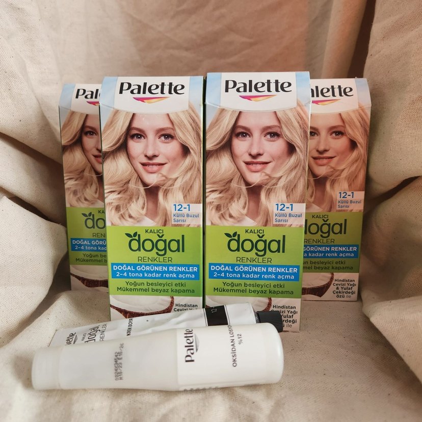 Palette 12-1 Küllü Buzlu kalıcı saç boyası, 2-4 tona kadar renk açma sağlar. 5 kutudur. 1 tanesinin kutusu yoktur ama herhangi bir sorunu yoktur.