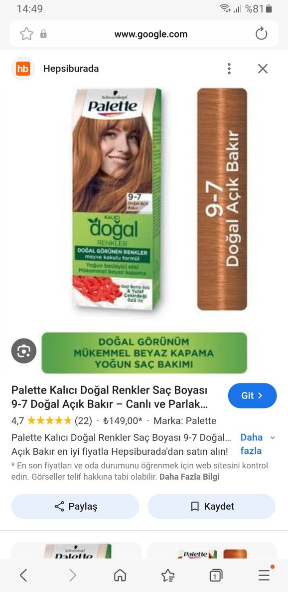 Palette 9-7 doğal açık bakır saç boyası, canlı ve parlak renk sunar. Mükemmel beyaz kapama ve yoğun saç bakımı sağlar. ♀️Bir tutam sacimda denedim sadece bir nohut tanesi kadar bile değil yani.