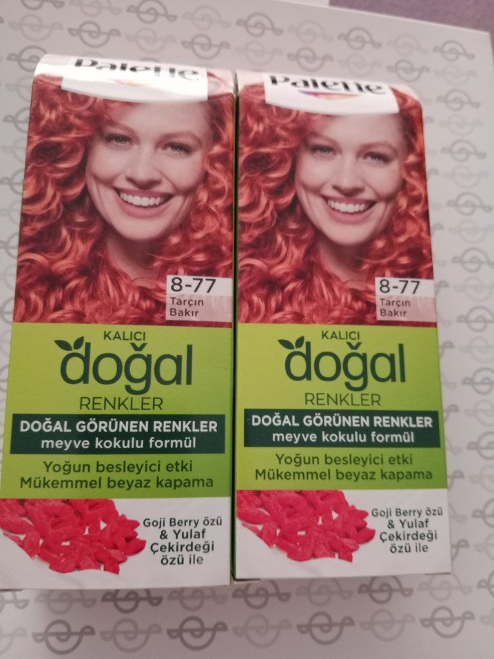 Palette kalıcı saç boyası 8-77 Tarcın Bakır, Goji Berry ve Yulaf Çekirdeği özleriyle yoğun besleyici etki sağlar. Mükemmel beyaz kapama ve meyve kokulu formülüyle doğal renk sunar. ikili fiyattır isteyen olursa tekli ilan açalım
