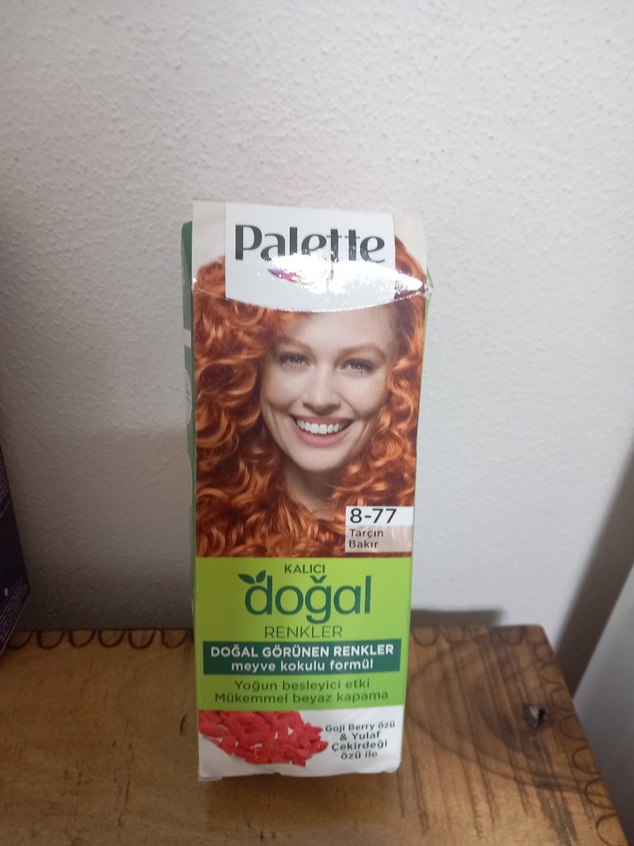 Palette 8-77 Tarçın Bakır kalıcı doğal saç boyası, meyve kokulu formülü, yoğun besleyici etkisi ve mükemmel beyaz kapaması ile öne çıkar. ürün yeni , kullanılmadı , paket biraz hasarlı