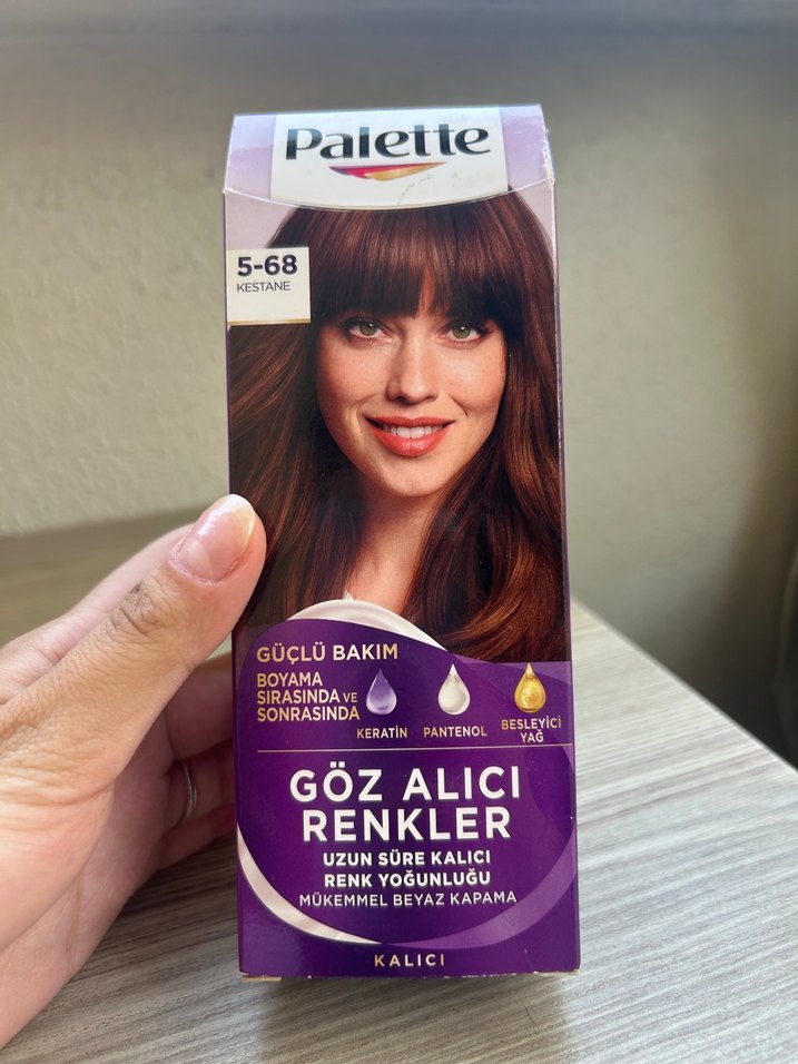 Palette kalıcı saç boyası 5-68 kestane renginde, keratin ve panthenol ile güçlü bakım sağlar, uzun süre kalıcı renk yoğunluğu ve mükemmel beyaz kapama sunar.