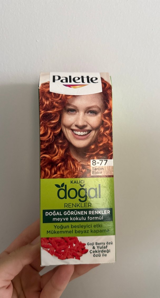 Palette kalıcı saç boyası, 8-77 tarçın bakır renginde doğal görünen renkler sunar. Yoğun besleyici etkisi ve mükemmel beyaz kapama sağlar. Meyve kokulu formüle sahiptir.