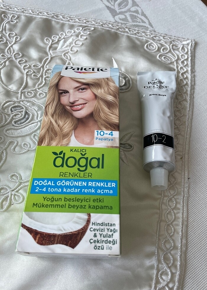 Palette 10.4 papatya saç boyası yeni ambalajında iki ile dört tona kadar renk açma özellikli yoğun besleyici etki mükemmel beyaz kapama Hindistan cevizi yağı yulaf çekirdeği Özü ile yanında hiç açılmamış palette 10-2 saç boyası hediye yani toplam iki boya bu fiyata ikisi de hiç açılmamıştır görsellerde ürünün açılmadığı gözükmektedir