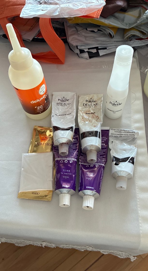 yarısı kullanılmış yarım yarım saç boyası Palette saç boyası seti, iki tüp saç boyası kremi, bir şişe oksidan ve argan yağı içerikli bakım kremi içerir.