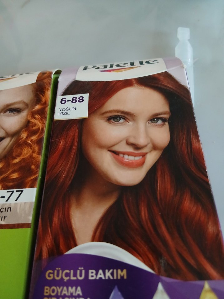 Palette saç boyası, 6-88 yoğun kızıl renginde, güçlü bakım formülü ile parlak renk ve sağlıklı saçlar sağlar. Koruyucu bakım içerir. ♀️saçım kızıldı yedek aldırırım sonra sarıya dönüş yaptım,3tane fiyatı 150 tl tane fiyatı 50 tl.