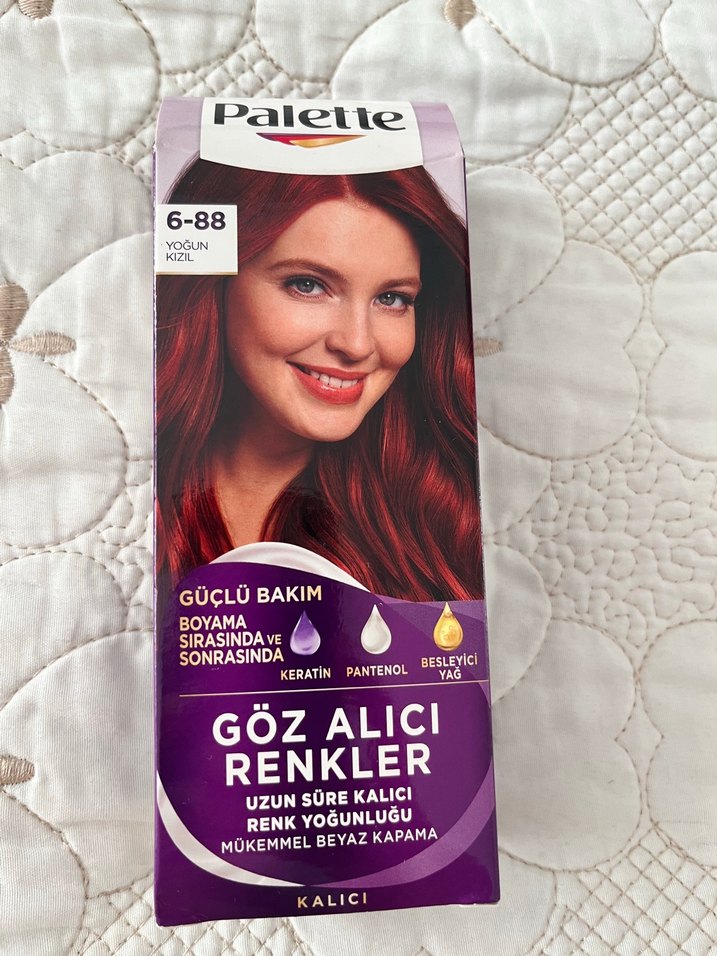 Palette 6-88 yoğun kızıl saç boyası, keratin, panthenol ve besleyici yağ içerir. Uzun süre kalıcı, göz alıcı renk ve mükemmel beyaz kapama sağlar. Elimde 2 kutu var