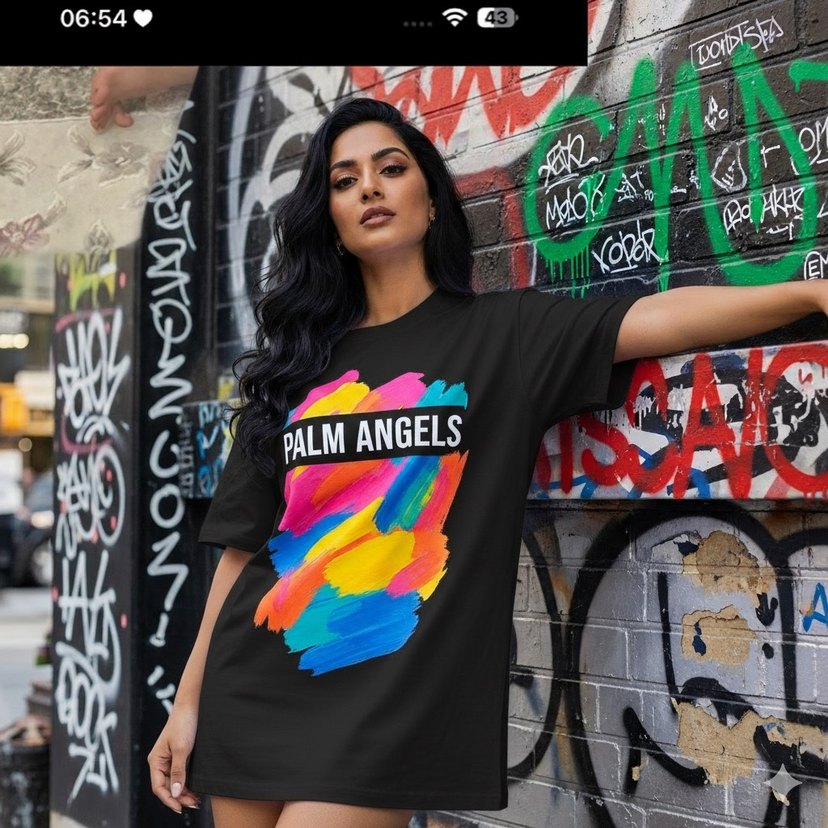 Bu erkek tişörtü kısa kollu, bol kesim ve yuvarlak yakalıdır. Çok renkli baskılı 'Palm Angels' yazısı ve canlı fırça darbeleriyle koyu renktedir. Kumaşı plastik hissi verir.