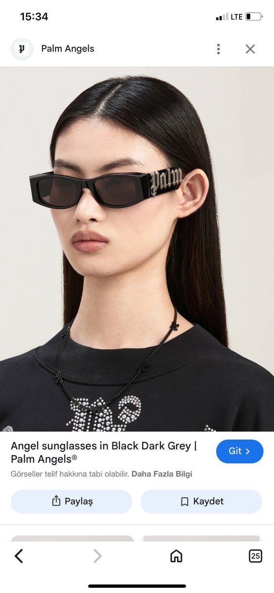 Palm Angels siyah güneş gözlüğü, koyu gri ton ve zincir detaylarına sahip, gotik stile uygun. ️