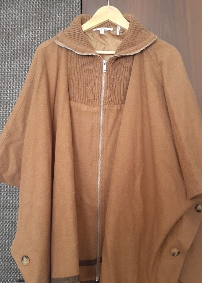 Taba rengi koton marka, panço tarzında, fermuarlı, kaşe kumaş xsmall fakat panço şeklinde olduğu için kalıbı geniş.L beden rahatlıkla giyebilir