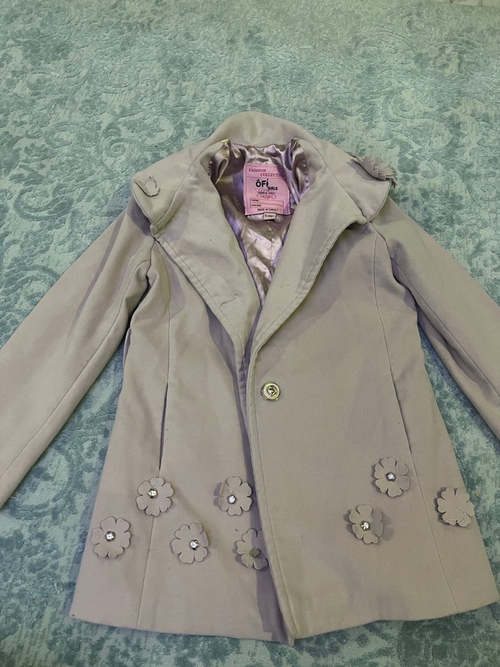 Düğmeli, yumuşak ve sıcak kumaştan yapılmış, nakışlı çiçek desenleriyle süslenmiş kaban