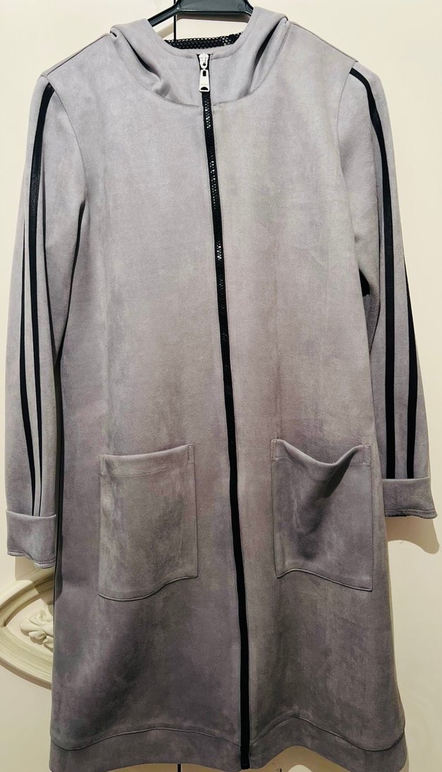 Gri süet kumaştan yapılmış, uzun boylu ve fermuarlı ceket Uzun kollu ve regular fit kesimlidir, cepleri ve yakası notched lapel tarzındadır. MOODBASIC MARKA 38-40 BEDEN UYGUNDUR .
