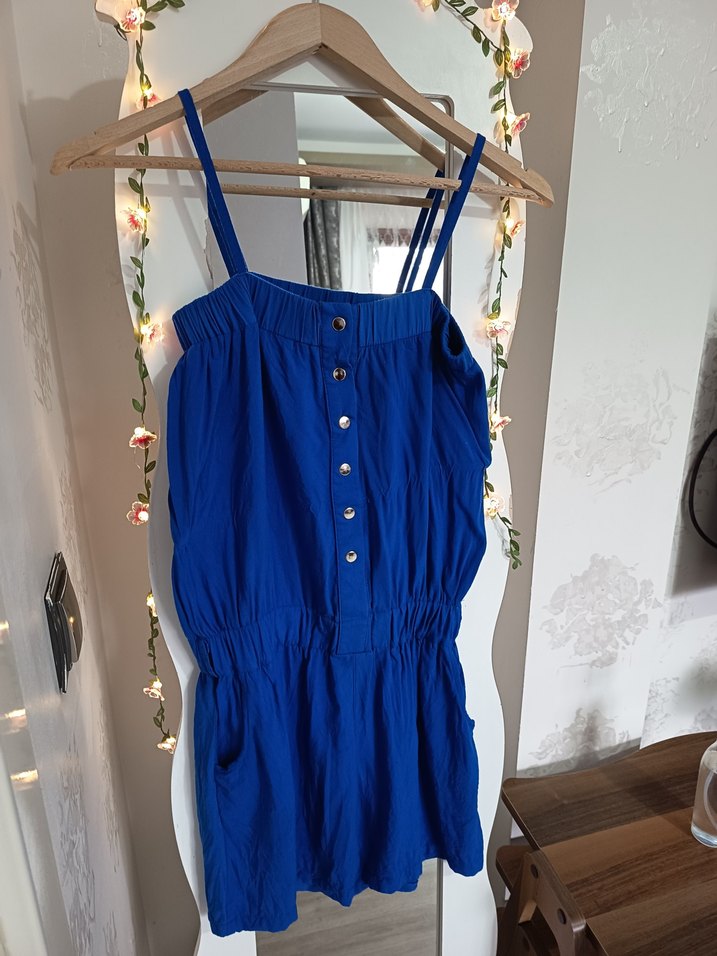 pamidor kız çocuk 12 yaş veya s beden tulum Düğmeli ön kısmı ve ince askıları olan, pamuklu kumaştan yapılmış, bol kesim mavi renkli kadın midi tulum jumpsuit. Günlük kullanıma uygun rahat bir model.