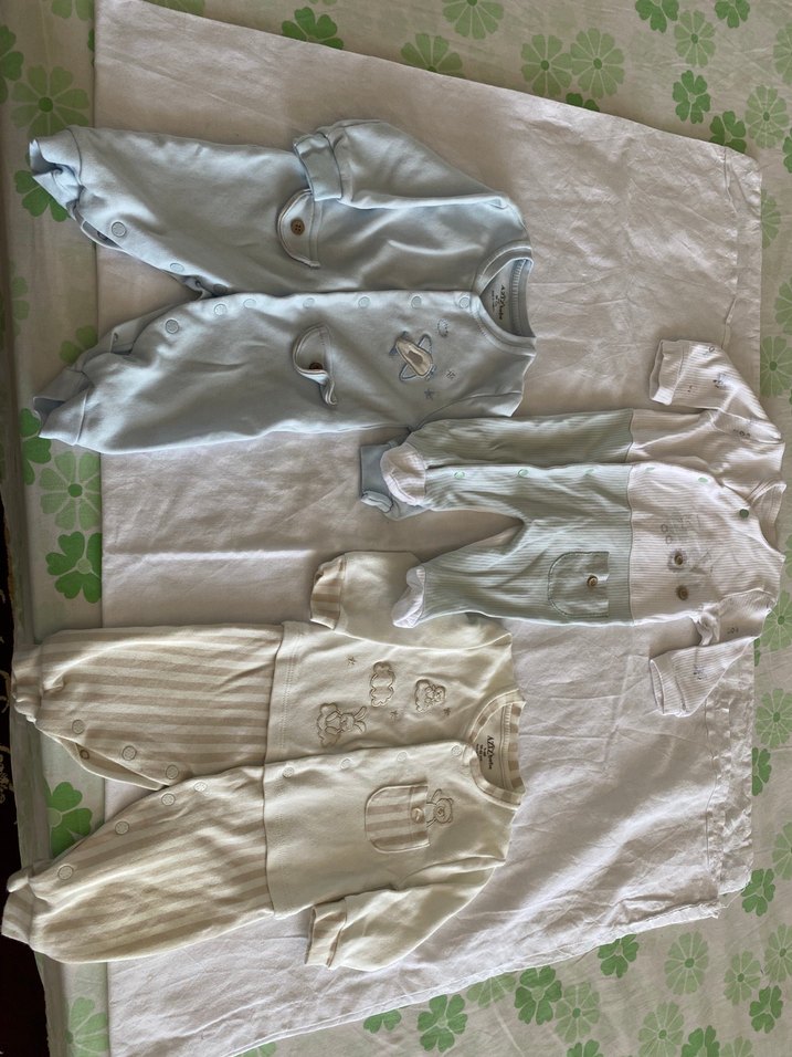 Bu bebek erkek takımı pamuk kumaştan, uzun kollu ve düğmeli. Düz desensiz, pastel renkte ve bisiklet yaka detaylıdır. Toplam 3 tulum
