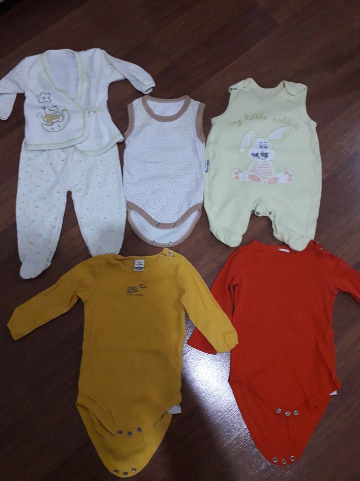 Pamuklu, açık sarı ve diğer renklerde bebek uyku kıyafetleri seti. Bodysuit ve ayaklı pijamalar rahat kullanım sağlar. Desensiz ve yumuşak dokulu.