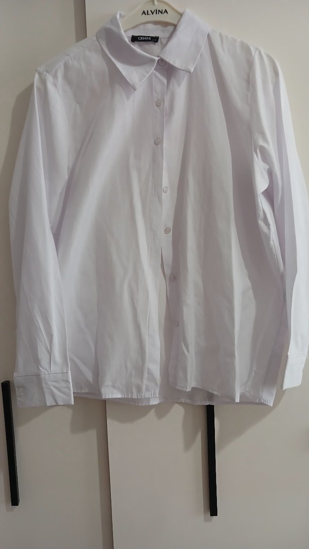 Pamuk kumaştan, beyaz renkte, düğmeli uzun kollu ve yakalı kadın gömleği. Normal boyda, rahat kesim ve sade tasarıma sahip, ofis için uygun.