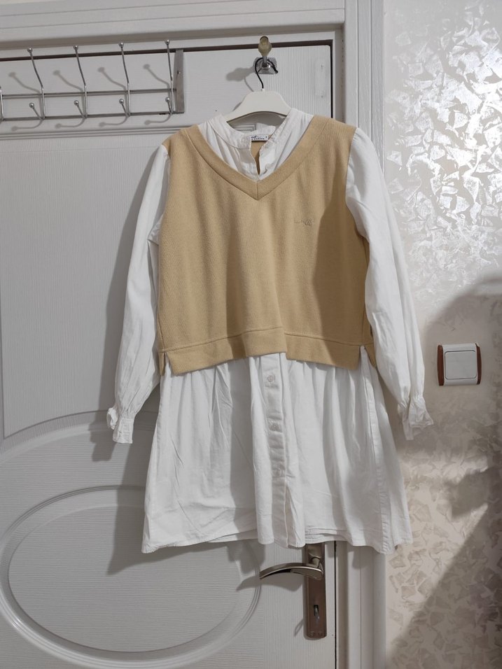 Pamuk kumaştan, uzun kollu, bisiklet yaka, bol kesim beyaz midi tunik. Günlük kullanıma uygun, rahat ve şık görünümlü.