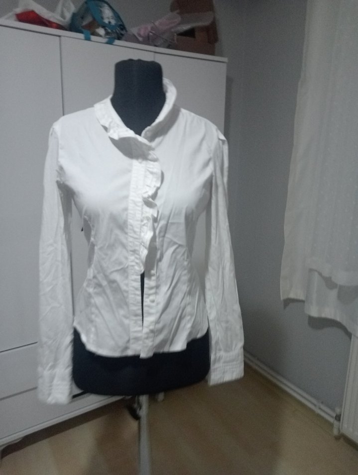 Pamuklu, beyaz, düğmeli ve yakalı uzun kollu kadın gömleği. Ofis ve günlük şıklık için uygun, vücuda oturan kesim.