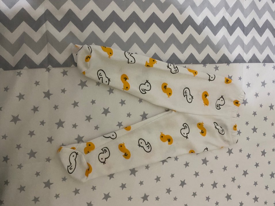Pamuklu çocuk uyku aksesuarı, beyaz zeminde sarı ve siyah çizgi film hayvan desenleri ile gri beyaz zigzag ve yıldız desenleri içerir.