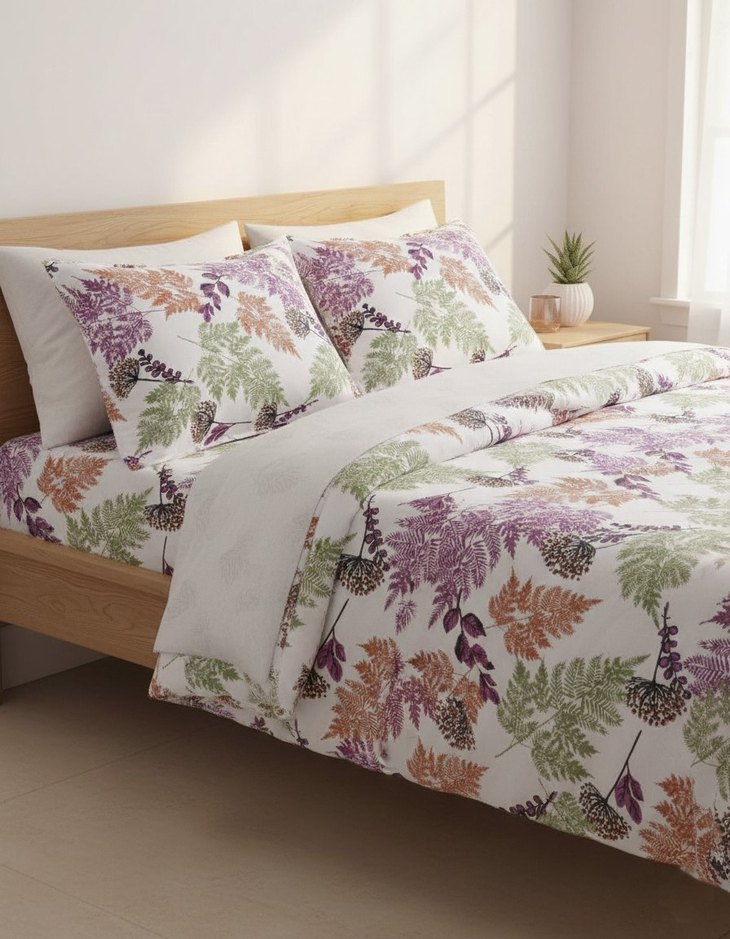 Çok renkli yaprak ve çiçek desenleriyle hafif baskılı nevresim, lastikli çarşaf ve yastık kılıfı takımı, doğal ve ferah bir görünüm sunar. Ölçüleri Nevresim: 200x220 Lastikli Çarşaf:160x200 Yastık Kılıfı :50x70 (2 adet)