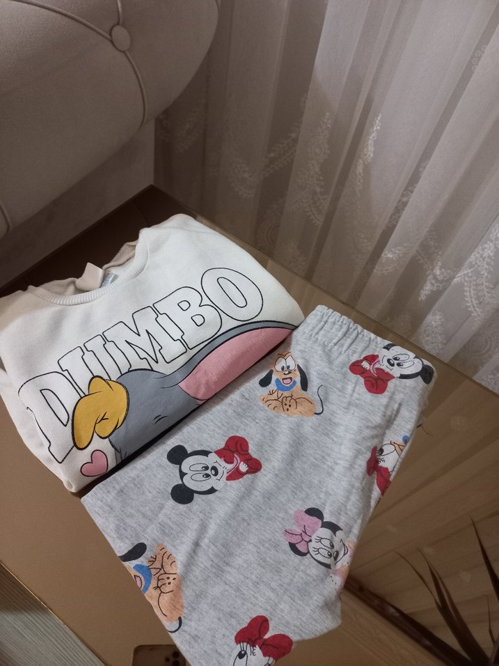 Pamuklu yumuşak kumaştan, gri renkte ve Mickey ile Minnie gibi renkli Disney karakter baskıları bulunan çocuk pijama takımı. Rahat ve eğlenceli uyku kıyafeti.