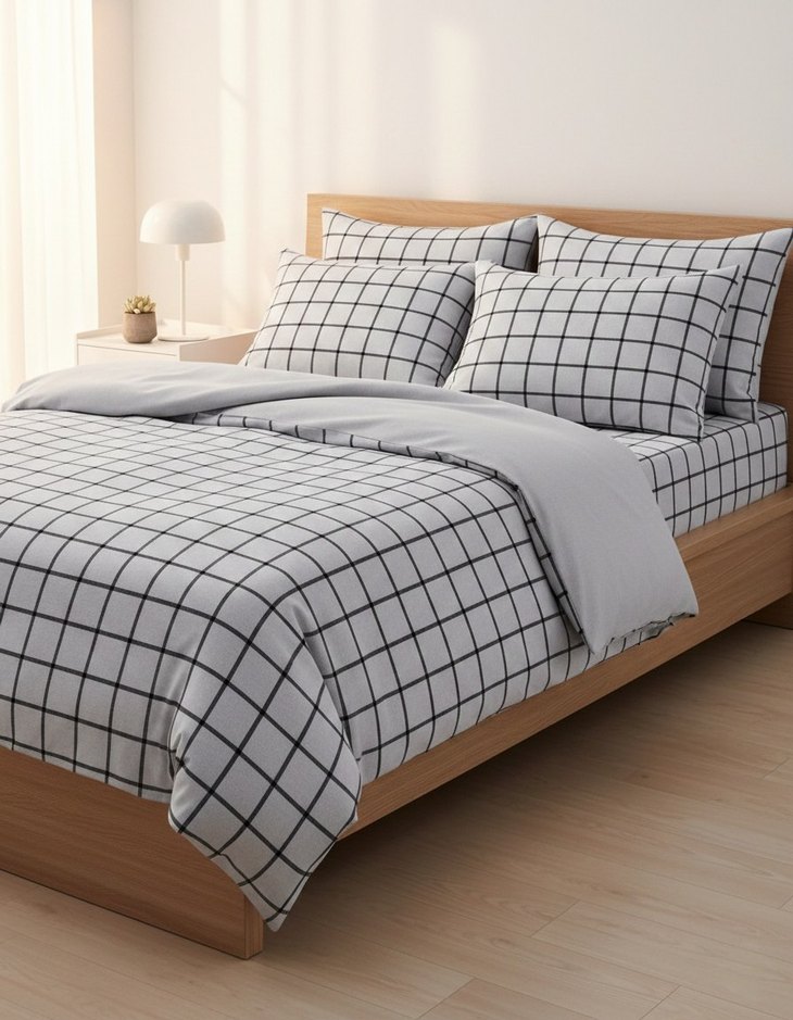 Gri tonlarda ekose desenli nevresim, Yastık kılıfı ve lastikli çarşaf takımı, yatak odanıza temiz ve modern bir görünüm sağlar ️.Ölçüleri Nevresim: 200x220 Lastikli Çarşaf:160x200 Yastık Kılıfı :50x70 (2 adet)