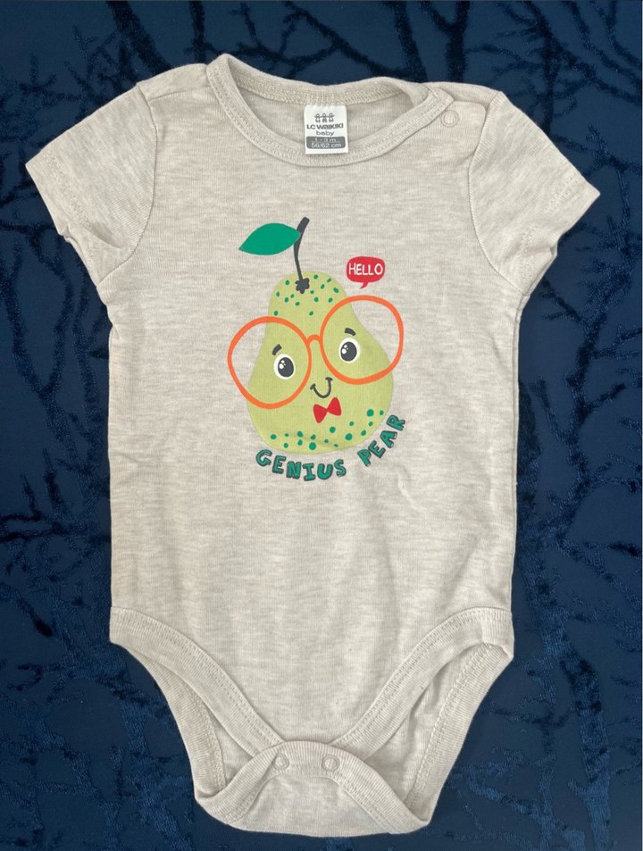 Pamuk kumaştan yapılmış, kısa kollu, bisiklet yaka gri erkek bebek body. Üzerinde kabartmalı baskılı 'GENIUS' ve 'HELLO' yazıları bulunur.