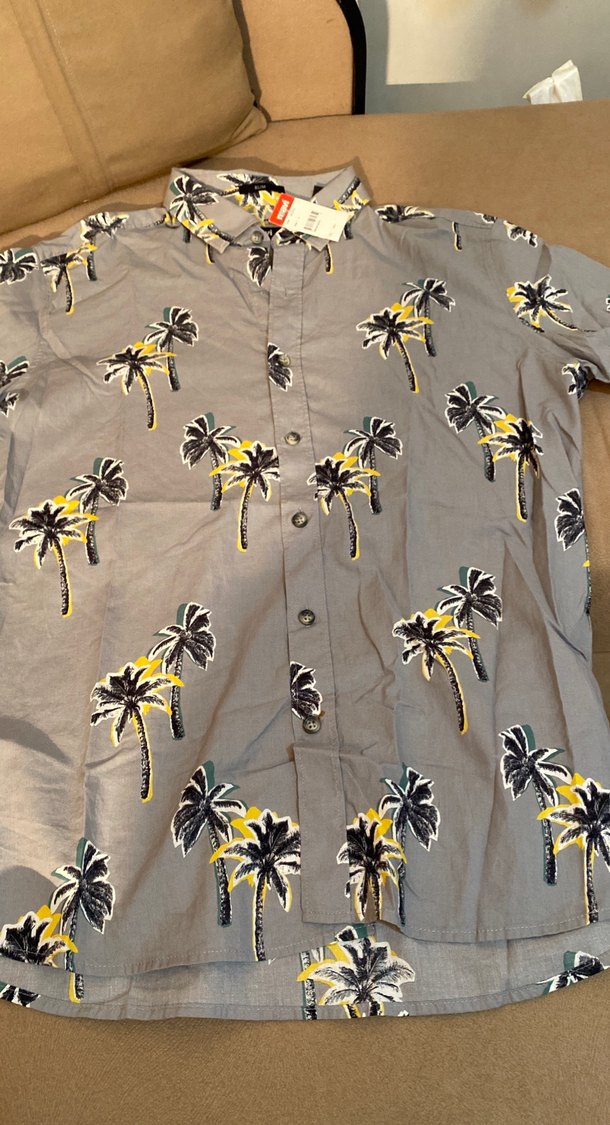 Pamuk kumaştan, gri renkli, kısa kollu, düğmeli ve palmiye desenli, rahat kesim erkek gömleği. Günlük sokak stili için uygundur.