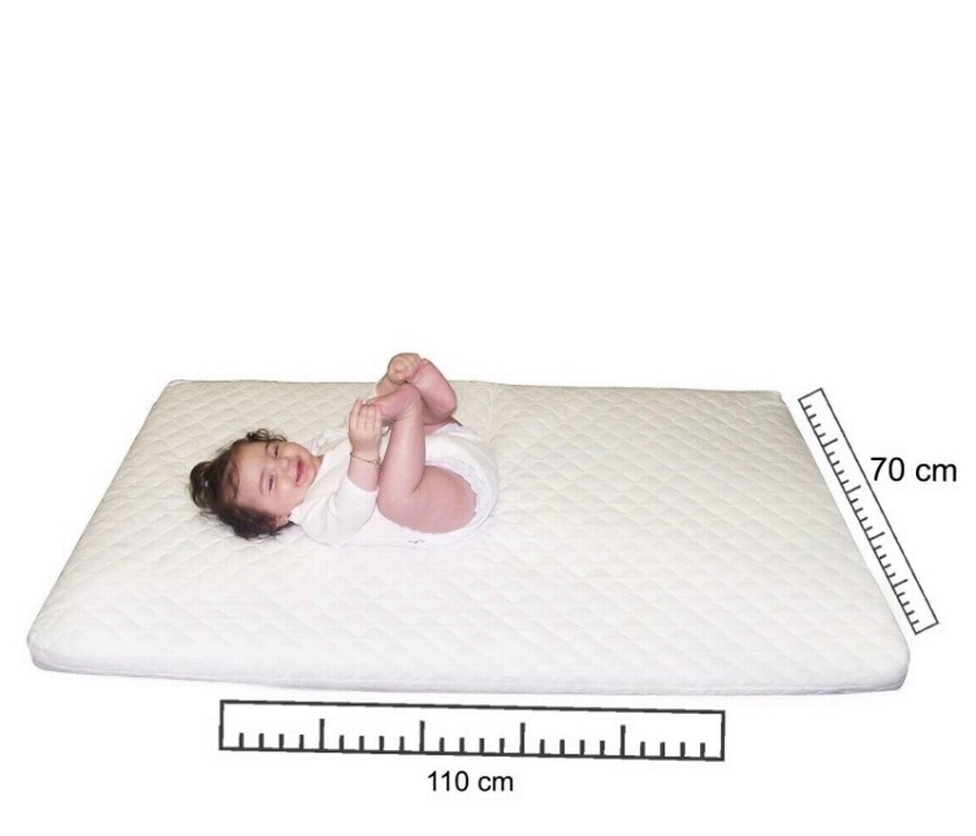 Yumuşak pamuklu kumaştan yapılmış, 110 cm genişliğinde beyaz bebek yatağıdır. Rahat uyku sağlar. 70x110x5 ölçüleri. Sorunsuz. Kullanmıyoruz. Baby Plus E Bebek markasıdır.