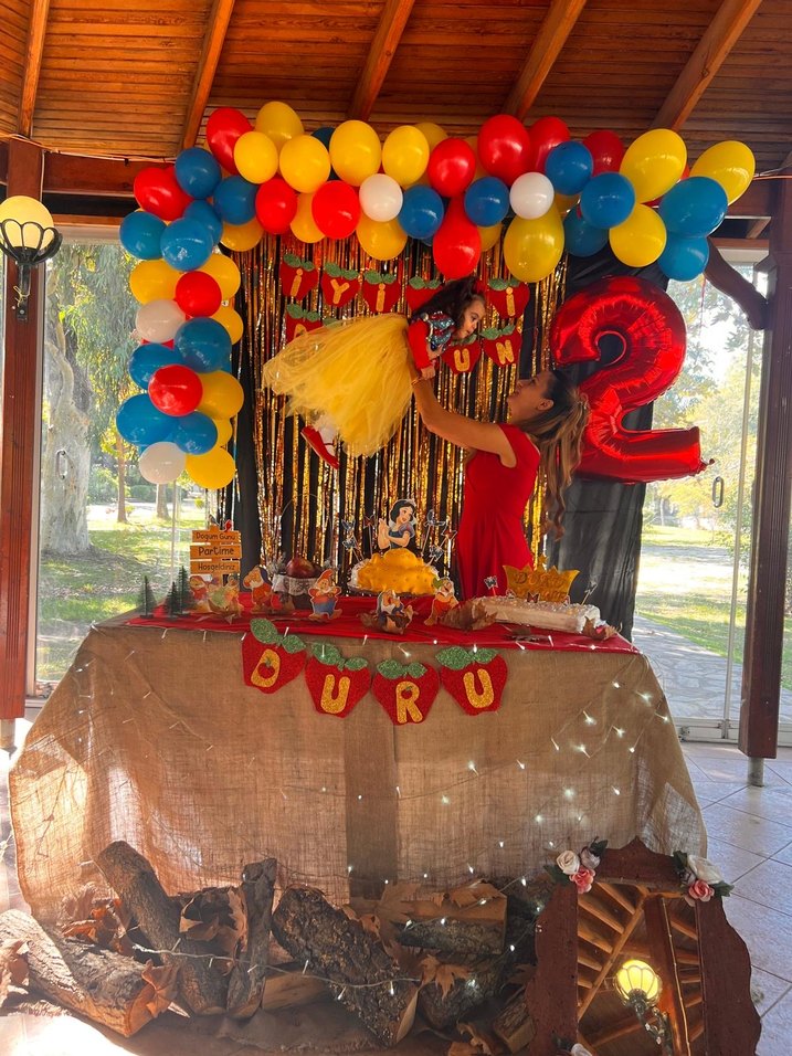 Kırmızı, sarı, mavi ve beyaz balonlardan oluşan renkli parti süsleme seti, kutlamalar için canlı bir ortam sağlar. 31 adet balon Pasta süsü pamuk prenses ve kelebekler Masa üstü ayakla duran pamuk prenses ve 7 cüceler İyi ki doğdun elma şeklimde banner
