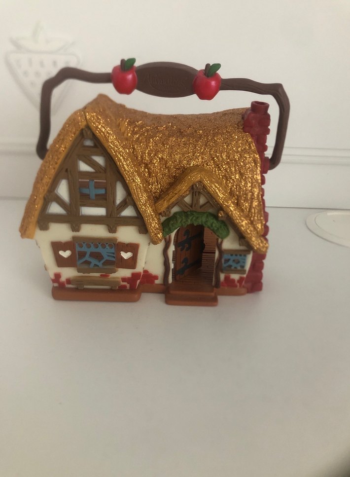 Altın sarısı çatısı ve sapında kırmızı elma süsleri olan küçük kahverengi ev figür. #pamukprenses #animator’s #animatör #disney #animators