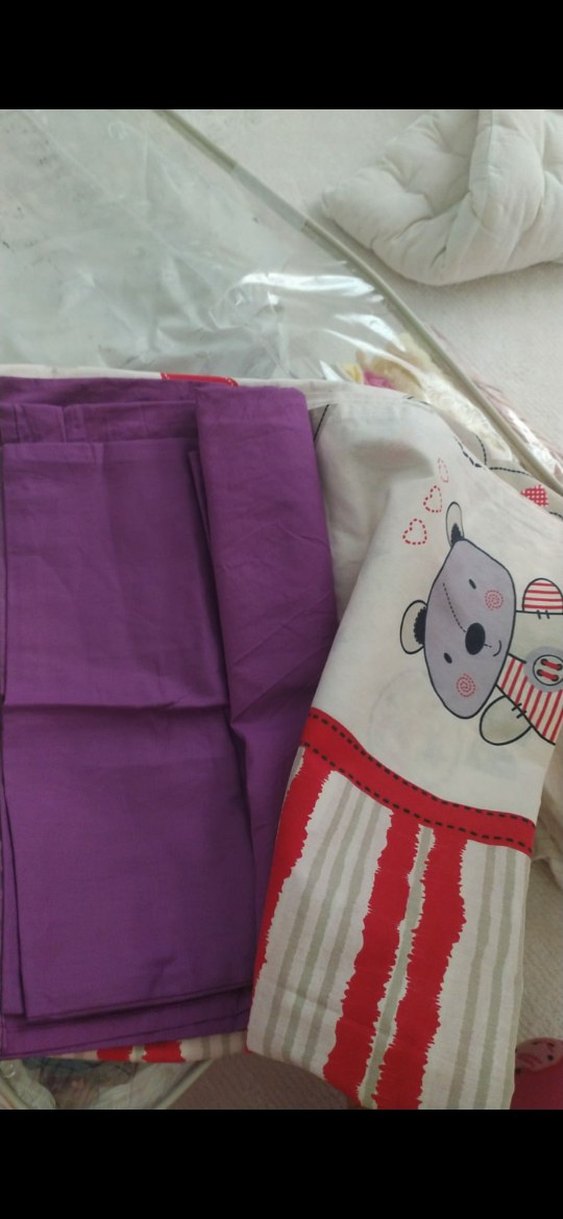 Renkli baskılı desenlere sahip, pamuk yumuşaklığında çocuk uyku seti. Mor ve desenli parçalar konfor sağlar. bebek uyku seti